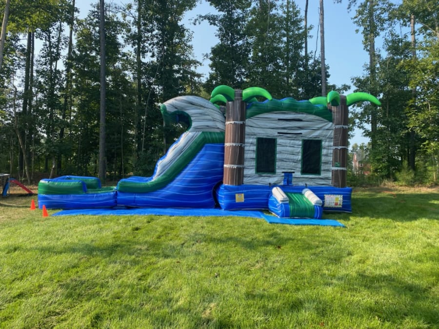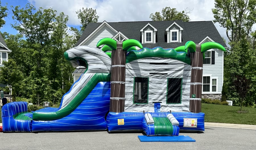 The Marble Madness Bounce House & Slide Combo: This is a 6 hour rental. A $100 non-refundable retainer fee is required. Dimensions: L 27' x W 15' x H 13' Required Setup Space: L 32' x W 20' x H 18' Maximum Users: 6-8 Children Wet /Dry Slide Option Double Lane Slide Basketball Hoop 100ft Water Hose Provided 100ft Extension Cord Provided Note: