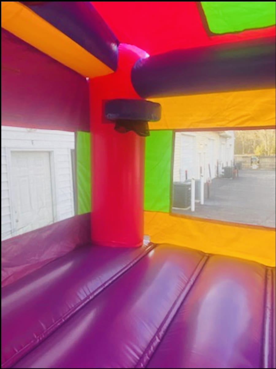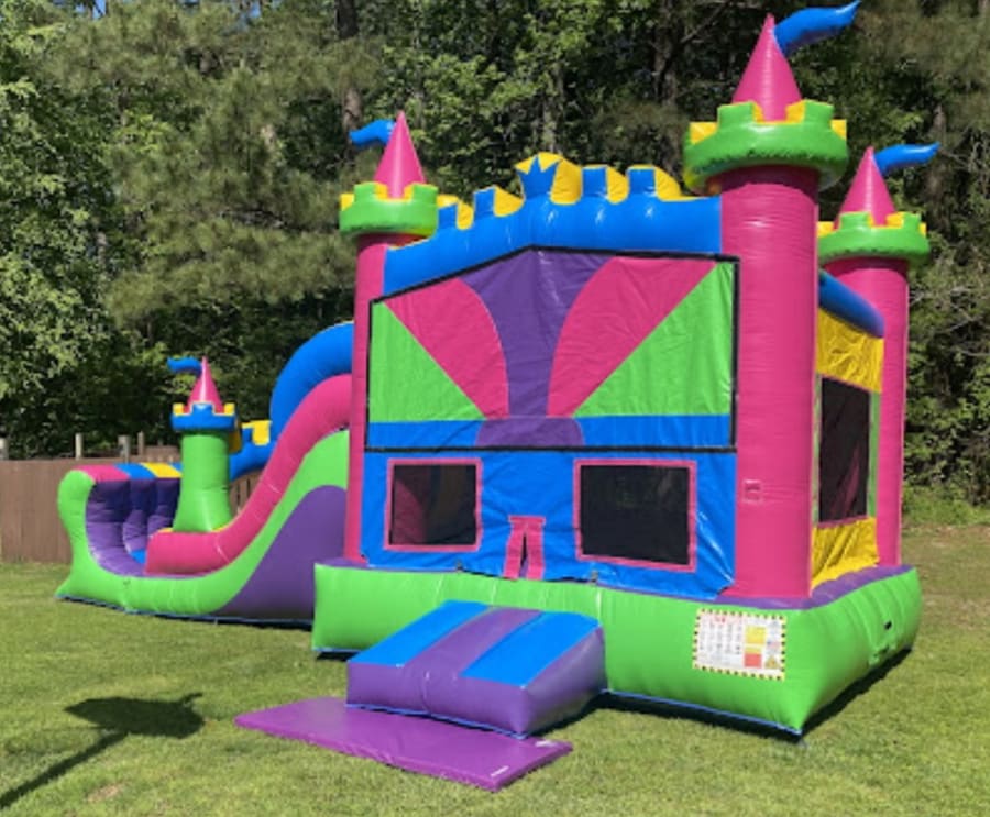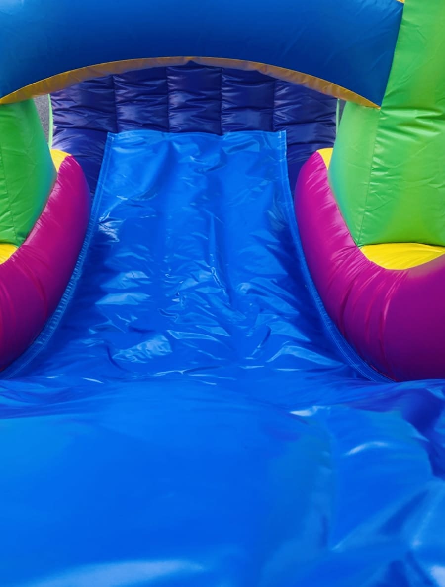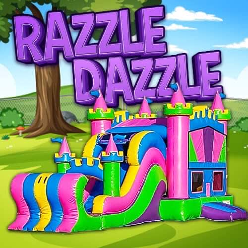 The Razzle Dazzle Bounce House & Slide Combo: This is a 6 hour rental. A $100 non-refundable retainer fee is required. Dimensions: L 34' x W 13' x H 15' Required Setup Space: L 39' x W 18' x H 20' Maximum Users: 6-8 Children Wet /Dry Slide Option Single Lane Slide Basketball Hoop 100ft Water Hose Provided 100ft Extension Cord Provided Note: