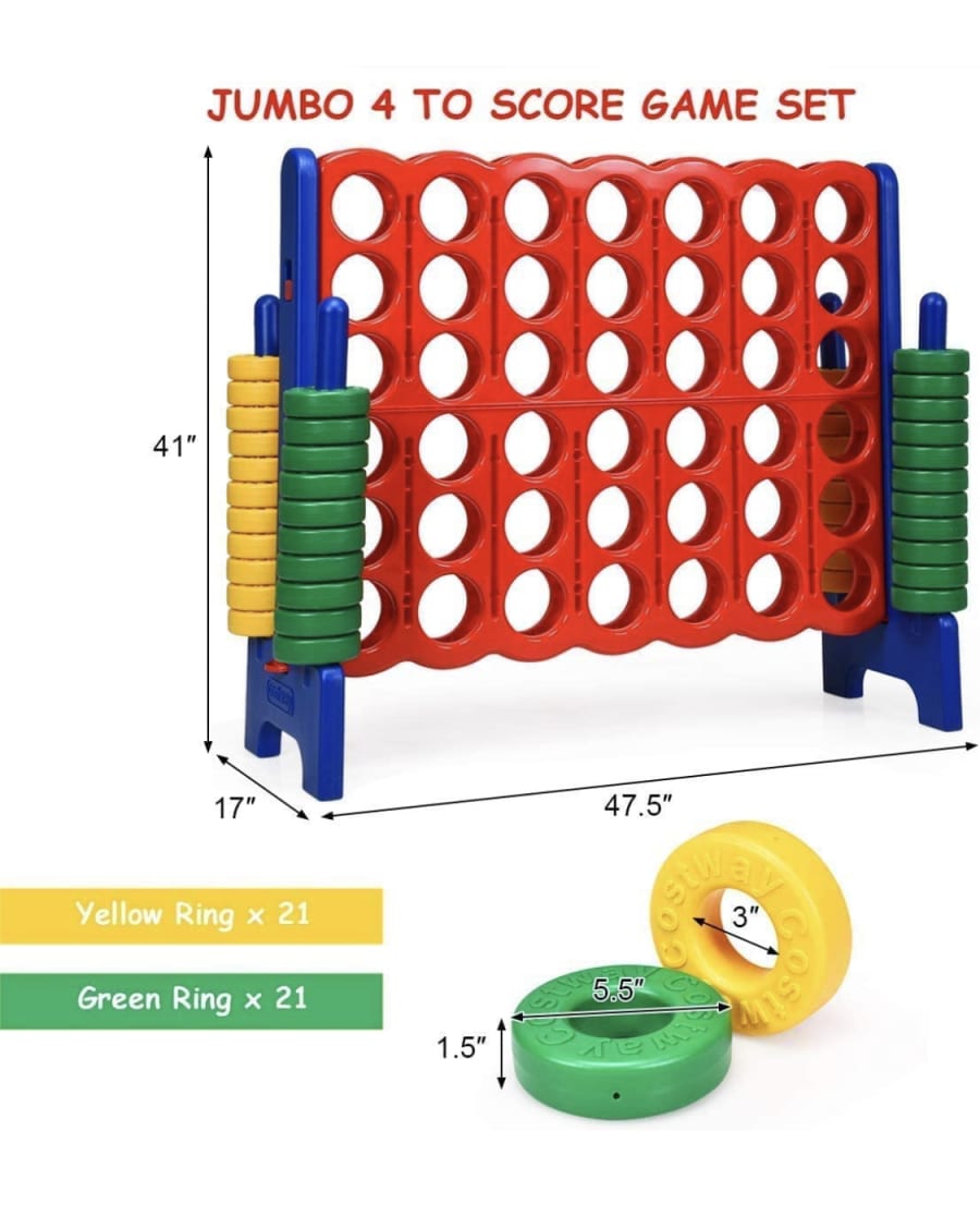 Be the first to get 4 colors in a row!! Rent the GIANT Jumbo-4-to-Score game today. It will provide tons of fun for children and adults alike.